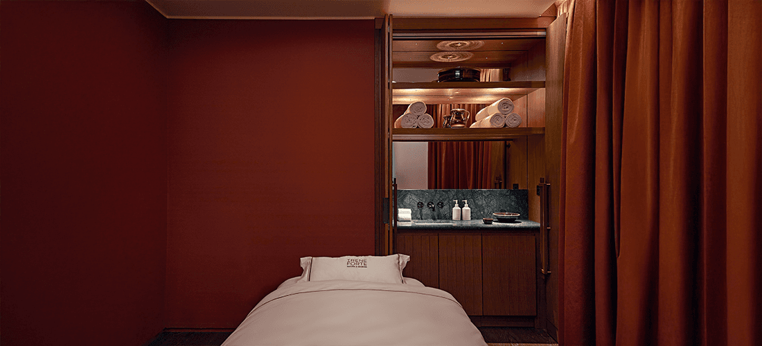 Step inside, and the transformation begins immediately. Designed by Paolo Moschino with Olga Polizzi, the spa’s interiors draw inspiration from nature’s architecture. Organic curves, earthy terracotta tones, honeyed woods, and chocolate leathers combine with sculpted walls to create an intimate, cocoon-like environment. Every detail, from the gentle lighting to the choice of textures, encourages a pause, a deep breath, a return to presence. The spa’s layout is as functional as it is beautiful. Three treatment rooms, a Forte Vita Bar for express facials and hair treatments, a nail salon, a thermal area with sauna, steam room, ice fountain, and experience showers, a relaxation suite with vibration sound beds, and a fully equipped Technogym gym ensure every wellness need is met under one roof.